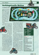 welchen Einfluss nehmen zu können. Zumindest bis die Mofas gerollt sind. Nun sammelt der aktive Spieler alle aus- gelegten Karten wieder ein, behält eine davon verdeckt für sich und reicht die übrigen Karten weiter, damit die anderen es ihm gleichtun können. Damit hat je- der seine erste Wette platziert, ein gutes Dutzend wird folgen. Sobald ein Zweirad die Ziellinie zum dritten Mal überfahren hat, steht es als Sieger fest. Ohne weitere Wettmöglichkeit bestimmen die im Wei- teren aufgedeckten Karten den zweiten und dritten Platz. Jede Wettkarte dieser