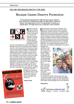 The Europäische Spielesammler Gilde (European game collectors’ guild, ESG) and the Sächsisches Institut für Spiel (Saxon institute for games, SIS) passionately work for the appreciation of games as a cultural asset. This page shows only a small part of their activities.