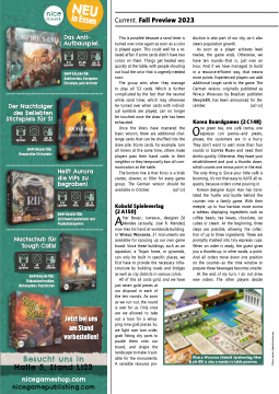 As soon as a player achieves level twelve, the game ends. Otherwise, we have ten rounds—that is, just over an hour. And if we have managed to build in a resource-efficient way, that means more points. Experienced players can add additional target cards to the game. The German version, originally published as World Wonders by Brazilian publisher MeepleBR, has been announced for De- cember. (sd/cs)