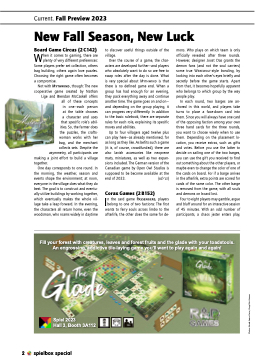 Up to four villagers aged twelve plus can play here—as already mentioned, for as long as they like. As befits such a game (it is, of course, crowdfunded), there are also lavish accessories like neoprene mats, miniatures, as well as two expan- sions included. The German version of the Canadian game by Open Owl Studios is supposed to be become available at the
