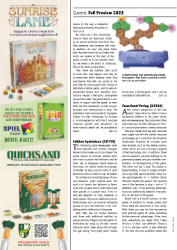 Then there are masters, who grant us more tiles, and helpers, who also let us place tiles while drawing cards. And parchments that dish out points at the end (like the various goal tiles). Bonsai is definitely a family game, and its well-im- plemented theme and beautiful illus- trations exude a feel-good atmosphere around the table. The plant theme is cer- tainly in vogue—and the game, at least after my first impression, is fast, uncom- plicated, and entertaining to play. The publishers have announced its European release on their homepage for October 6. A mini-expansion with the 2 modules “vigorous growth and specialists” for more tactical depth will be available at Essen. (ab/cs)
