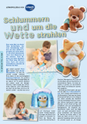 Für Kinder ab einem halben Jahr proji- ziert der süße 2-in-1 Sternenlicht-Pin- guin einen richtigen Sternenhimmel an die Zimmerdecke. Setzt man den kleinen Polarvogel mit Halstuch in sein eisblaues Iglu, strahlt entweder das Nachtlicht oder das mehrfarbige Firmament. Außer- dem ertönen harmonische Lieder und Melodien, je nach Uhrzeit als Tag- oder Schlaflieder, oder auch atmosphärische Naturgeräusche. Ein integrierter Ge- räuschsensor merkt, wenn das Baby weint, und spielt automatisch beruhi- gende Schlaflieder oder Natursounds ab. Wachen die Kinder mitten in der Nacht auf, finden sie sich in einer ent- spannten Umgebung wieder und schla- fen schneller wieder ein. Am Morgen